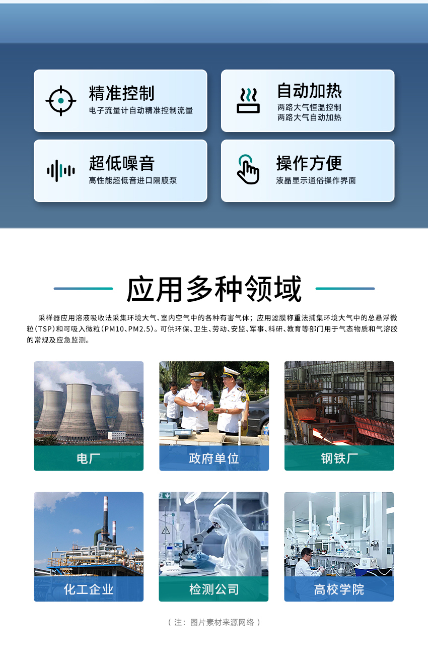 1. 電子流量計(jì)自動(dòng)精準(zhǔn)控制流量,流量無波動(dòng),恒流采樣,優(yōu)良的流量標(biāo)定軟件。 2. 大氣具有恒溫自動(dòng)加熱功能,部分型號(hào)支持恒溫控制。 3. 大氣使用高性能超低音進(jìn)口隔膜泵,極大提高穩(wěn)定性,使用壽命長(zhǎng)、超低噪音。 4. 大氣使用高效防倒吸干燥器設(shè)計(jì),有效防止誤操作導(dǎo)致吸收液倒吸,增強(qiáng)儀器安全性。 5. 大氣使用優(yōu)質(zhì)濾塵濾芯,實(shí)現(xiàn)顆粒物過濾功能,防止進(jìn)入氣路干擾采樣,同時(shí)保護(hù)采樣泵和氣路。 6. 大氣采樣兩路(四路)設(shè)計(jì),采樣方式靈活,可采集兩種(四路)氣體或者平行樣,并可分別單獨(dú)控制。 7. 顆粒物采樣采用無刷控制風(fēng)機(jī),噪聲小,負(fù)載大,適合連續(xù)長(zhǎng)時(shí)間工作。 8. TSP/PM10(PM2.5)采樣頭采用鋁合金材質(zhì),抗靜電吸附。 9. 實(shí)時(shí)監(jiān)測(cè)計(jì)壓、計(jì)溫,自動(dòng)補(bǔ)償流量偏差,進(jìn)一步優(yōu)化了流量精確度。 10.自動(dòng)調(diào)節(jié)對(duì)比度的中文液晶顯示屏,適應(yīng)于寒冷地區(qū)采樣,通俗軟件顯示界面,實(shí)現(xiàn)良好人機(jī)交互。 11.自動(dòng)計(jì)算累計(jì)采樣體積,并同時(shí)根據(jù)氣壓、溫度換算標(biāo)況采樣體積。 12.支持個(gè)性化定制,用戶可根據(jù)需求選配電池、打印機(jī)、U盤等。